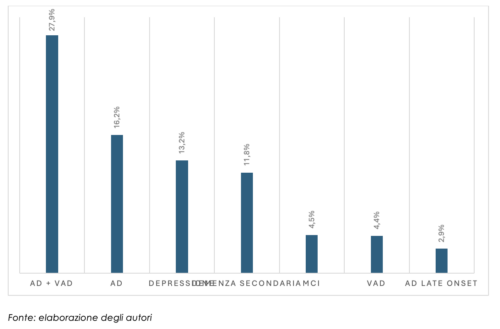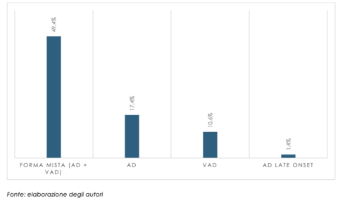 Grafico 1 – Eziologia del disturbo neurocognitivo in CRA. Demenza mista o demenza di tipo misto, che combina la Malattia di Alzheimer (AD) con la Demenza Vascolare (VaD). AD: Demenza di Alzheimer. VaD: Demenza Vascolare. AD Late Onset: Alzheimer ad esordio tardivo, generalmente dopo i 65 anni.
