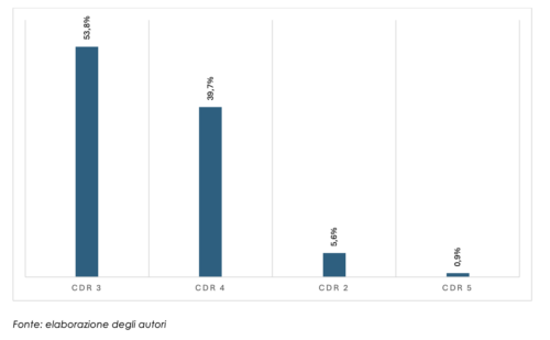 Grafico 2. Stadiazione della gravità della demenza secondo la scala CDR: Clinical Dementia Rating Scale. CDR 2 indica una demenza moderata e CDR 3 indica una demenza grave. I gradi 4 e 5 della Clinical Dementia Rating (CDR) rappresentano rispettivamente una demenza molto grave (CDR 4) e una demenza terminale (CDR 5).